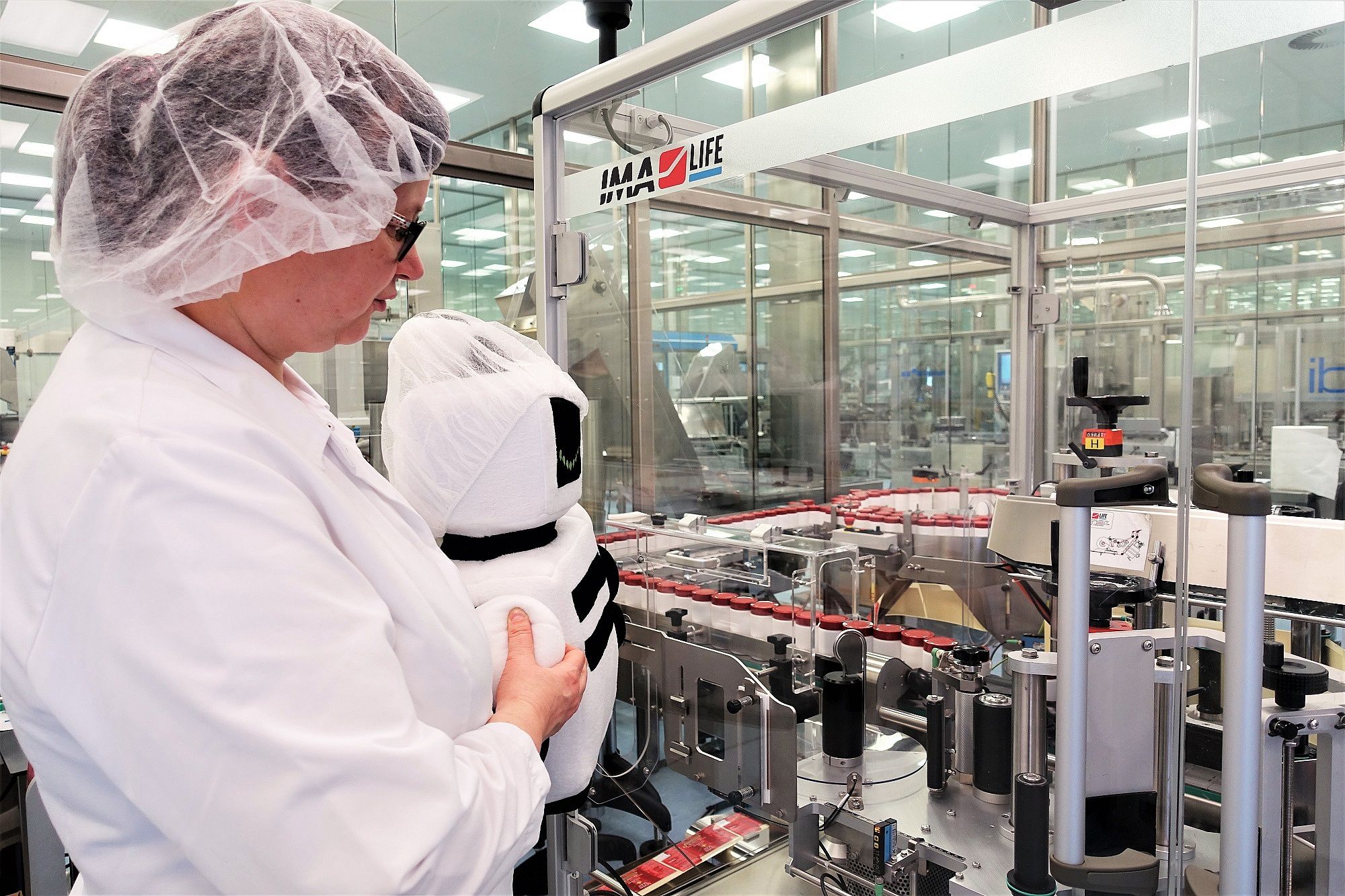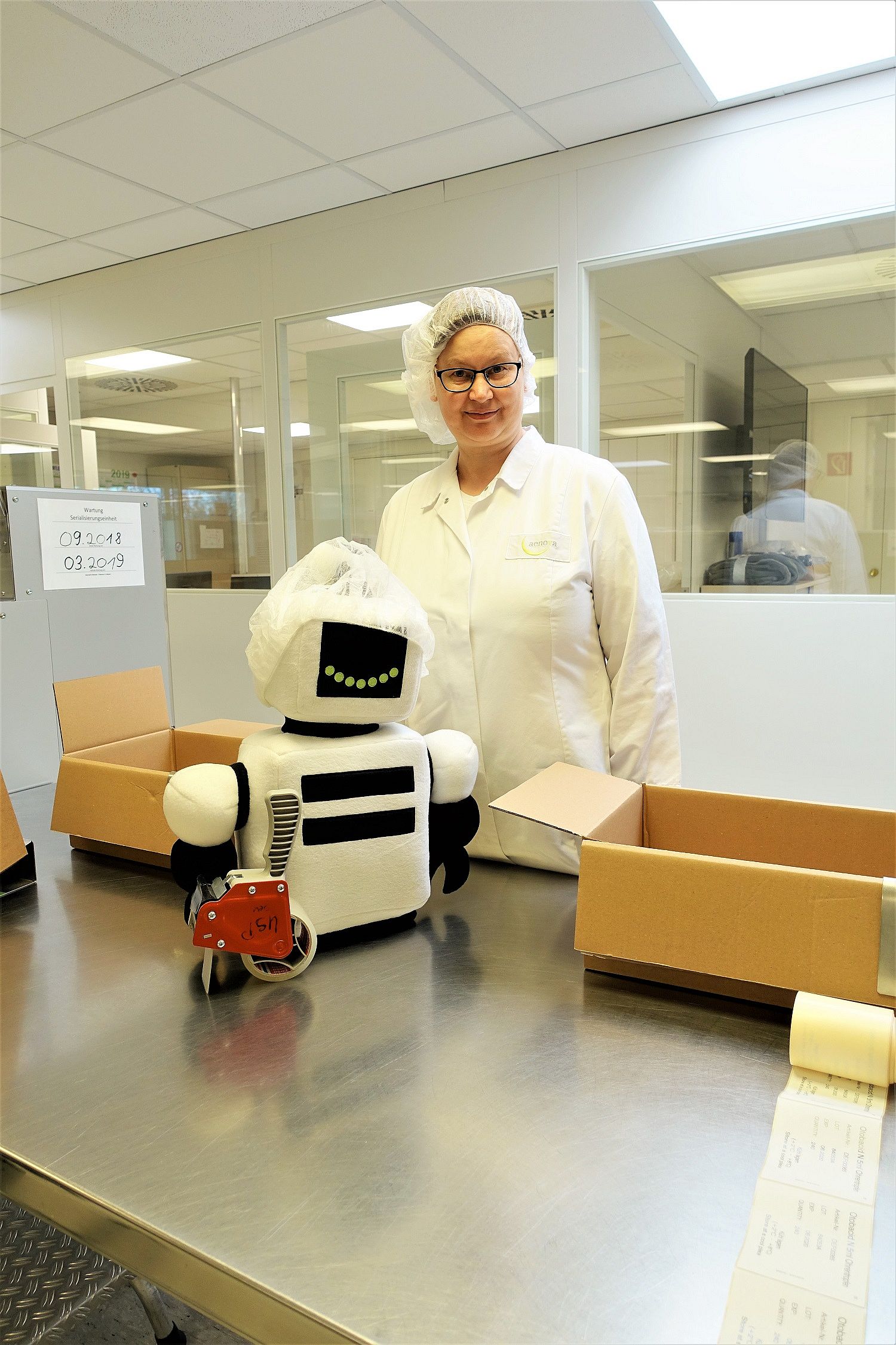 Sonja Dürr: Wir müssen zum Beispiel bei bestimmten Produkten eine Gebläsehaube tragen, außerdem Schutzbrillen, Mundschutz, Handschutz, unsere Pharmakleidung und ein Haarnetz.